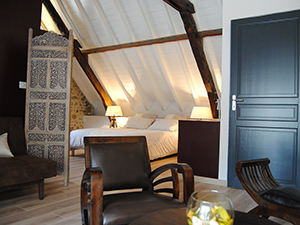 Chambre Campanule avec salon (1 lit de 180 avec articulation électrique de relaxation),1 banquette enfant (supplément: voir tarifs) salle d'eau privative.